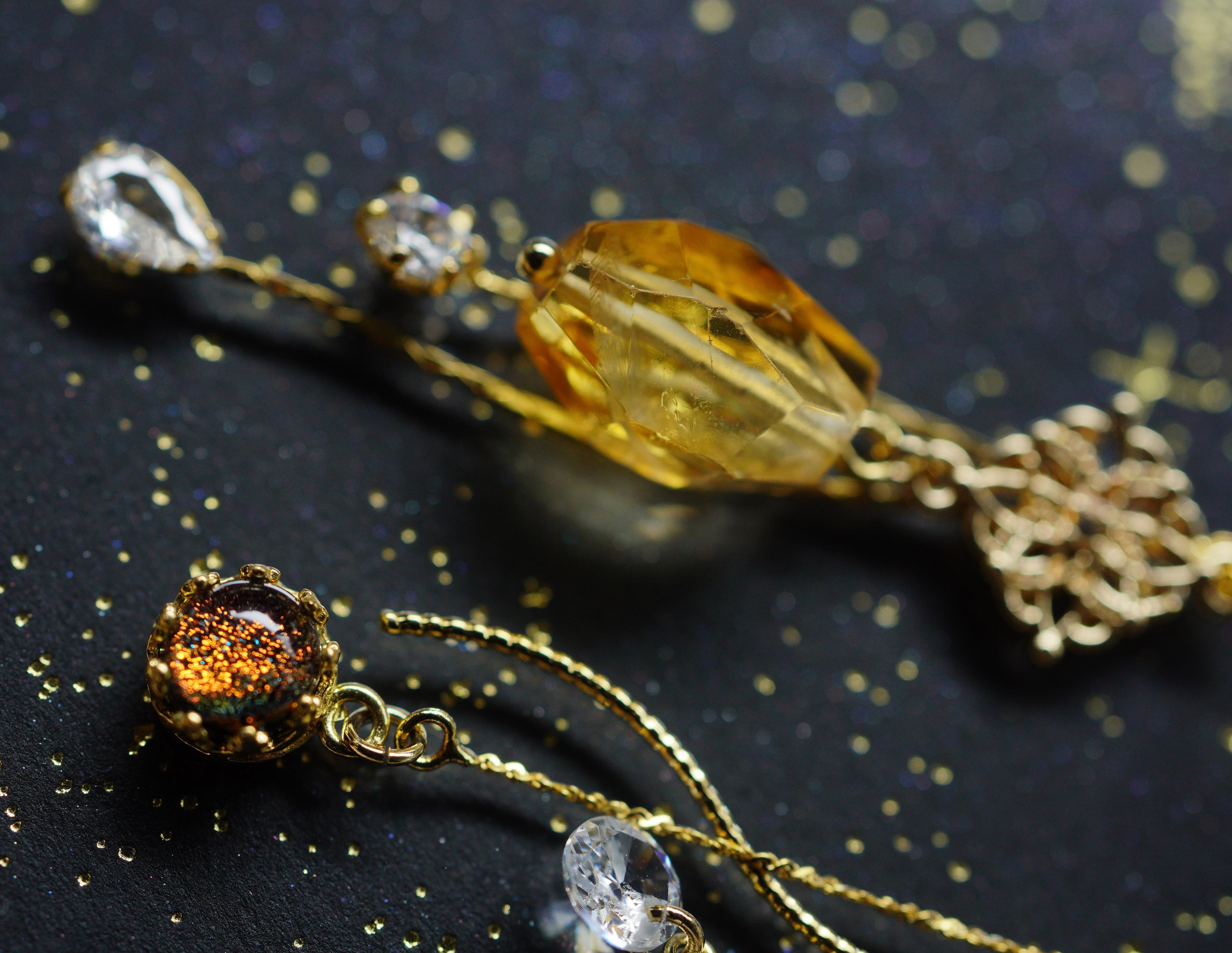 黄昏時の庭園。その空に一つの金色の星。 透明感のあるシトリンと、ダイクロガラスが美しい作品です。 素材:サージカルステンレス ゴールドカラー トップ:メッキ ガラス 石:シトリン サイズ:アシンメトリー 40㎜~50㎜